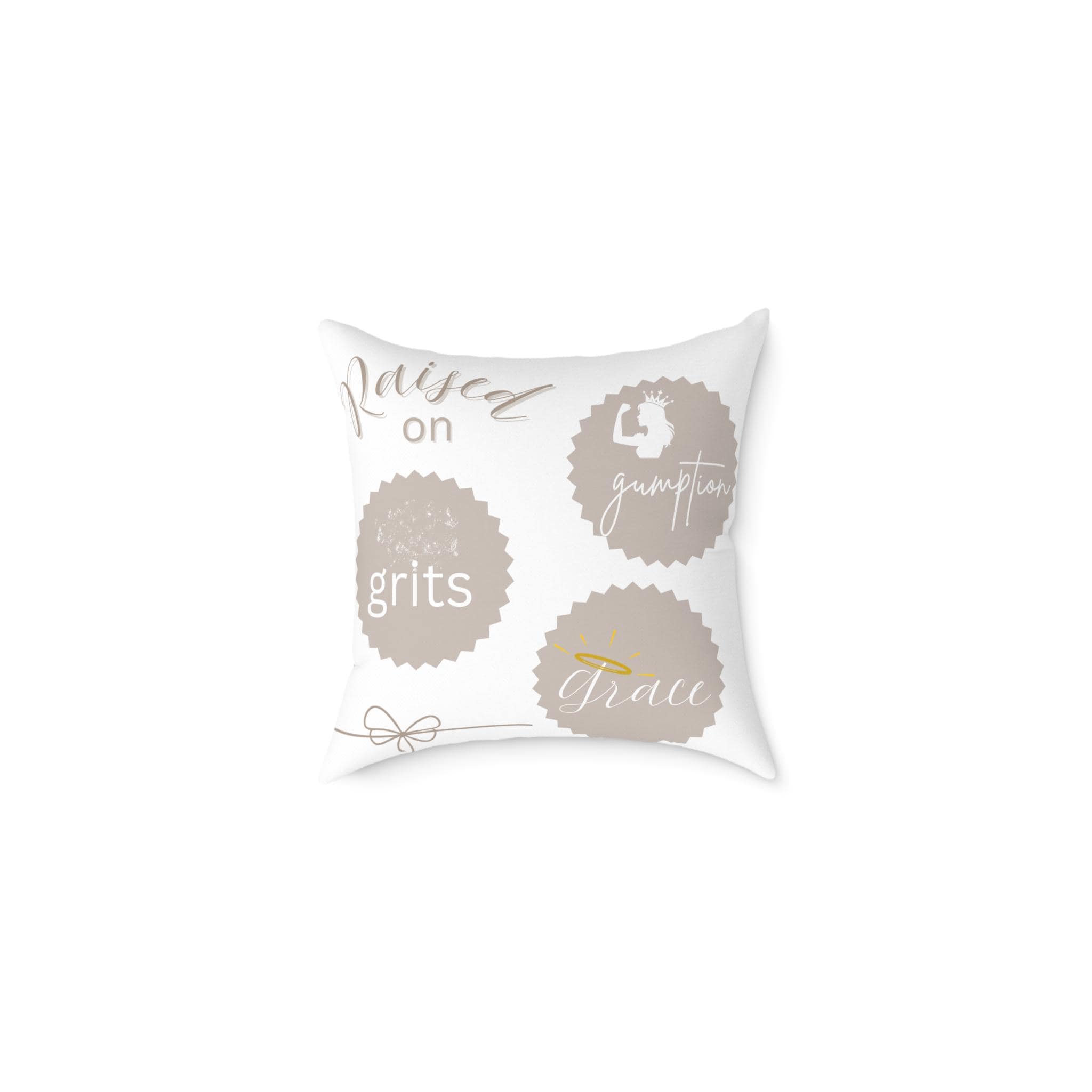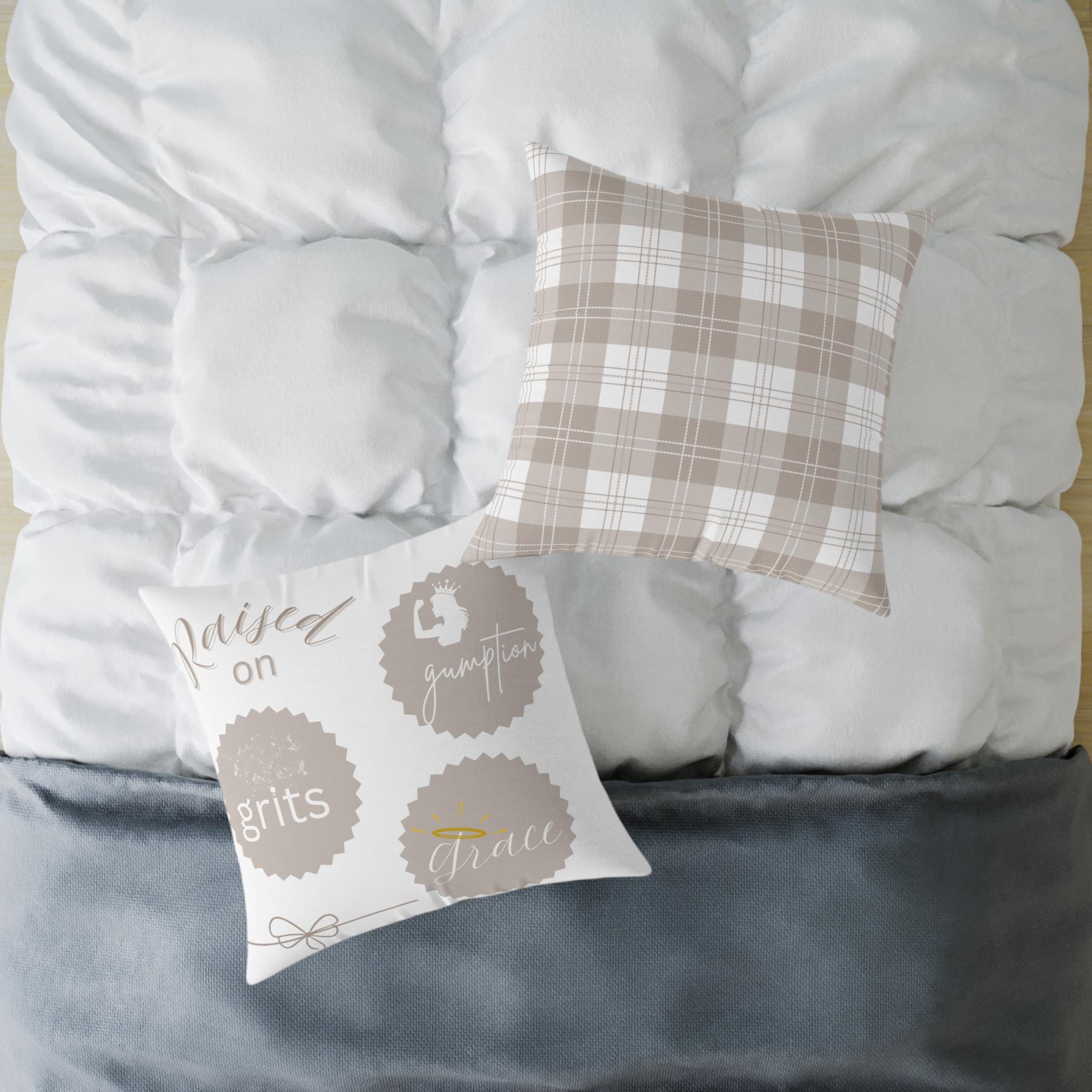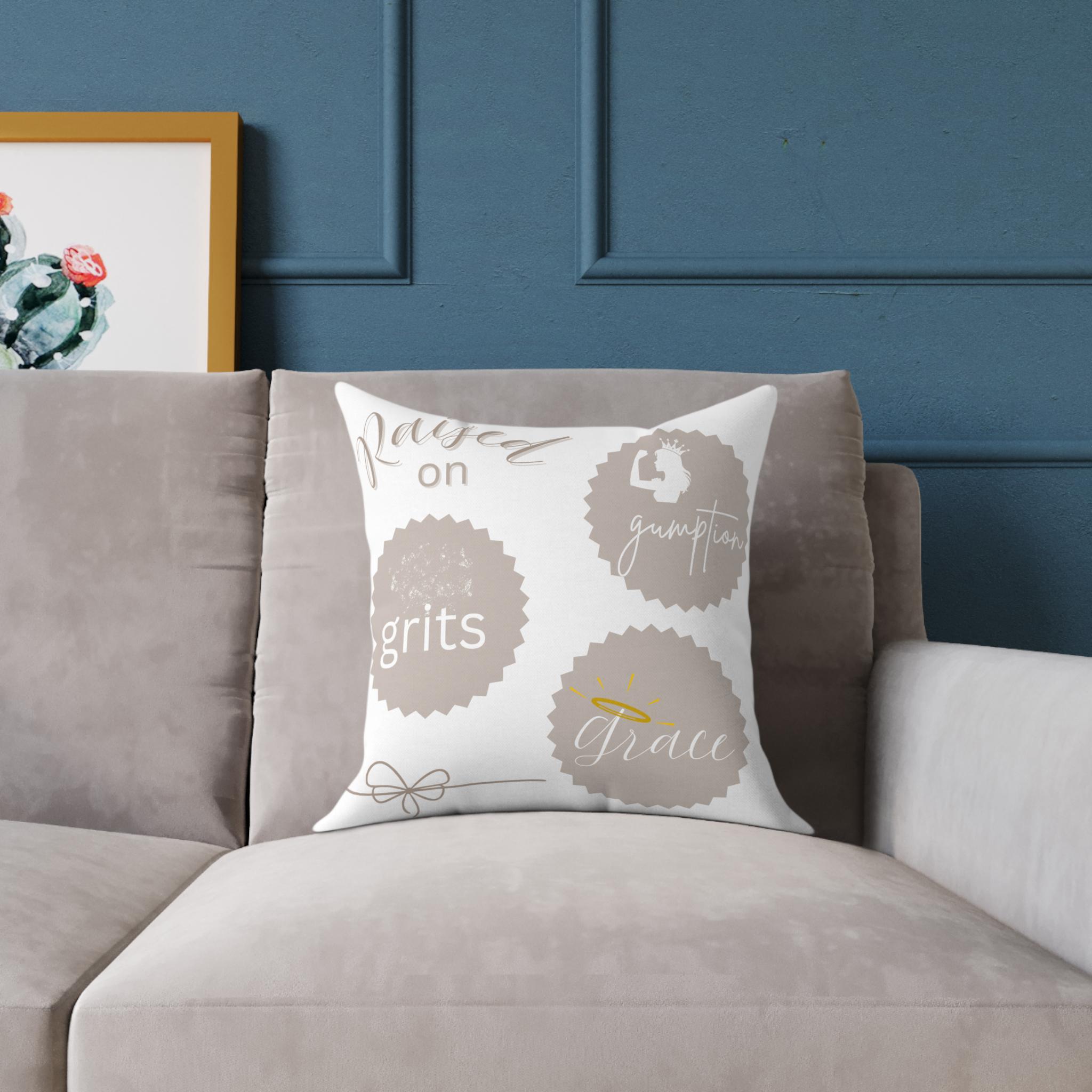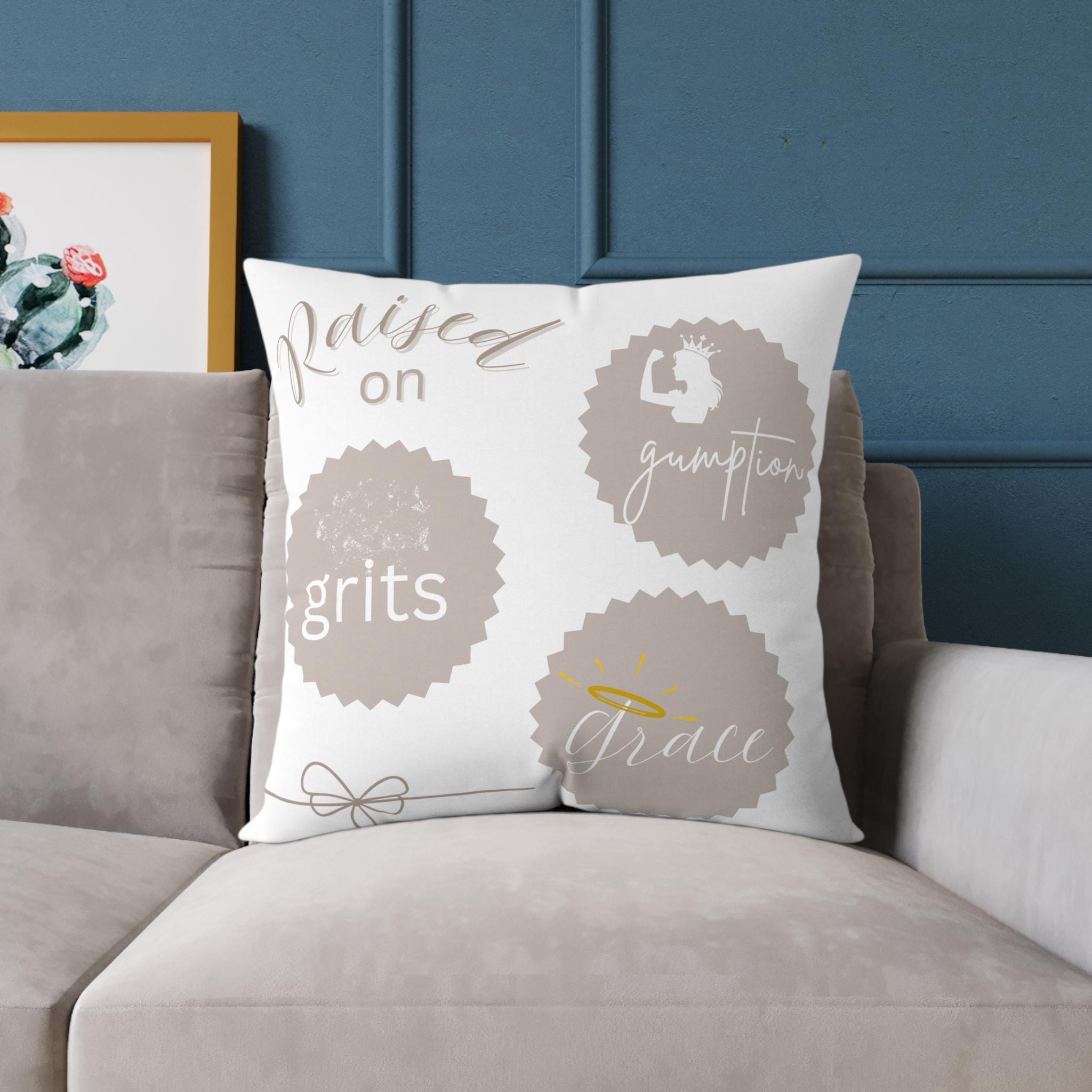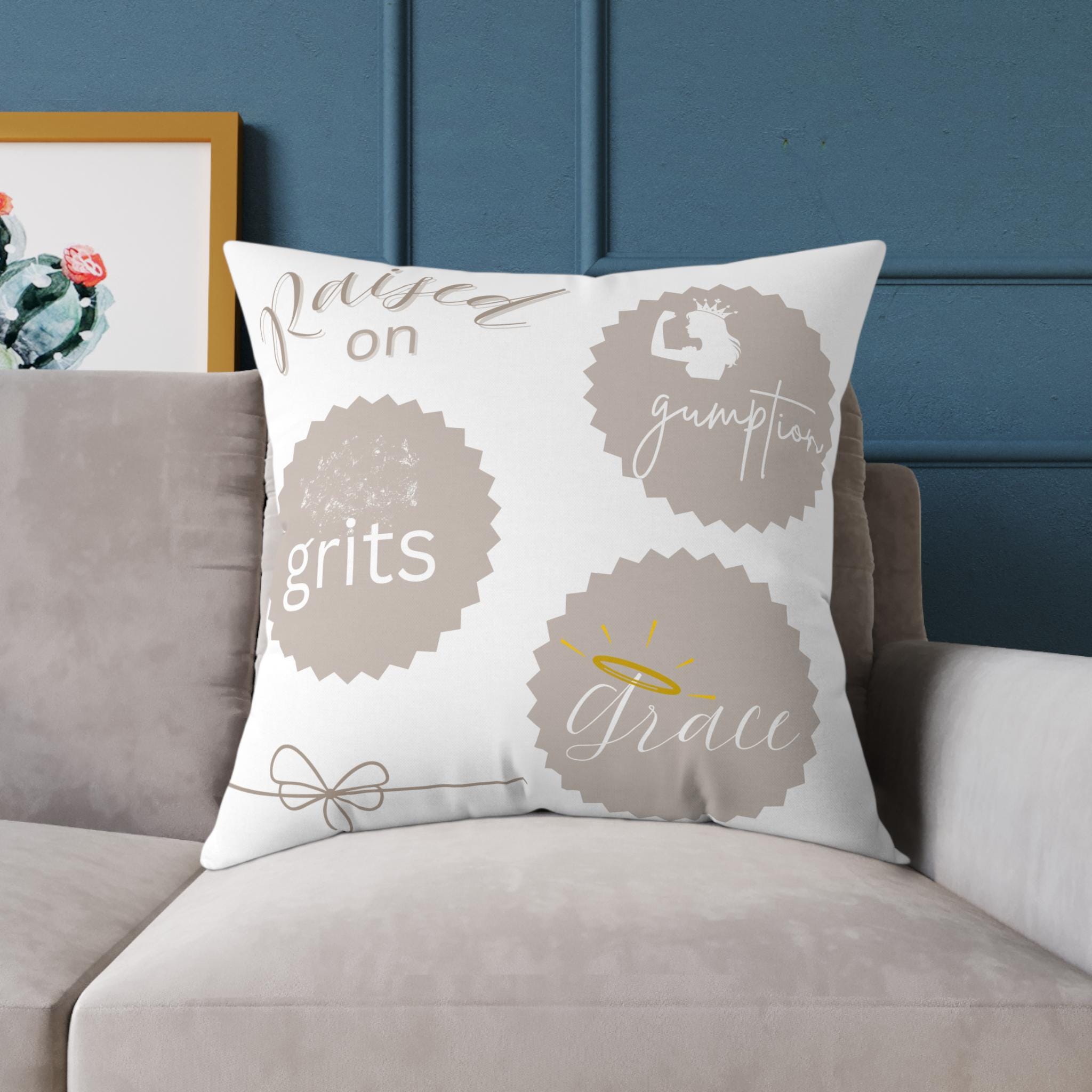 Southern sass meets everyday style. This Raised on Grits, Grace & Gumption throw pillow adds charm, humor, and a little attitude to any home. Perfect for living rooms, porches, dorms, or as a fun gift for the Southern belle in your life.