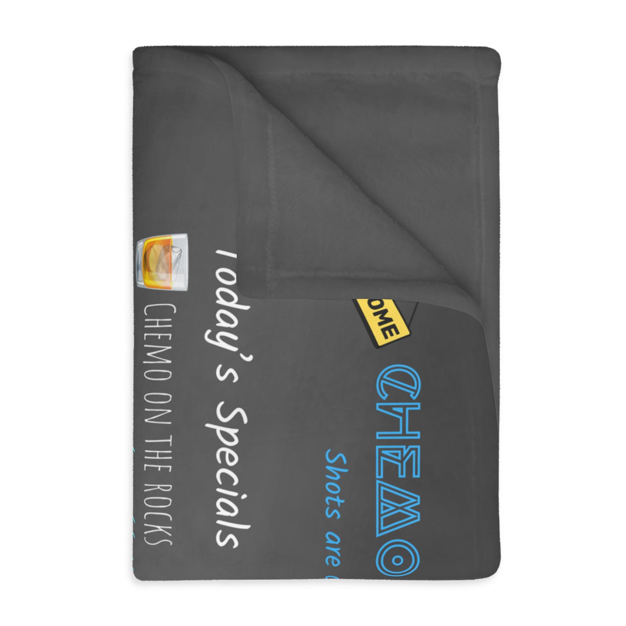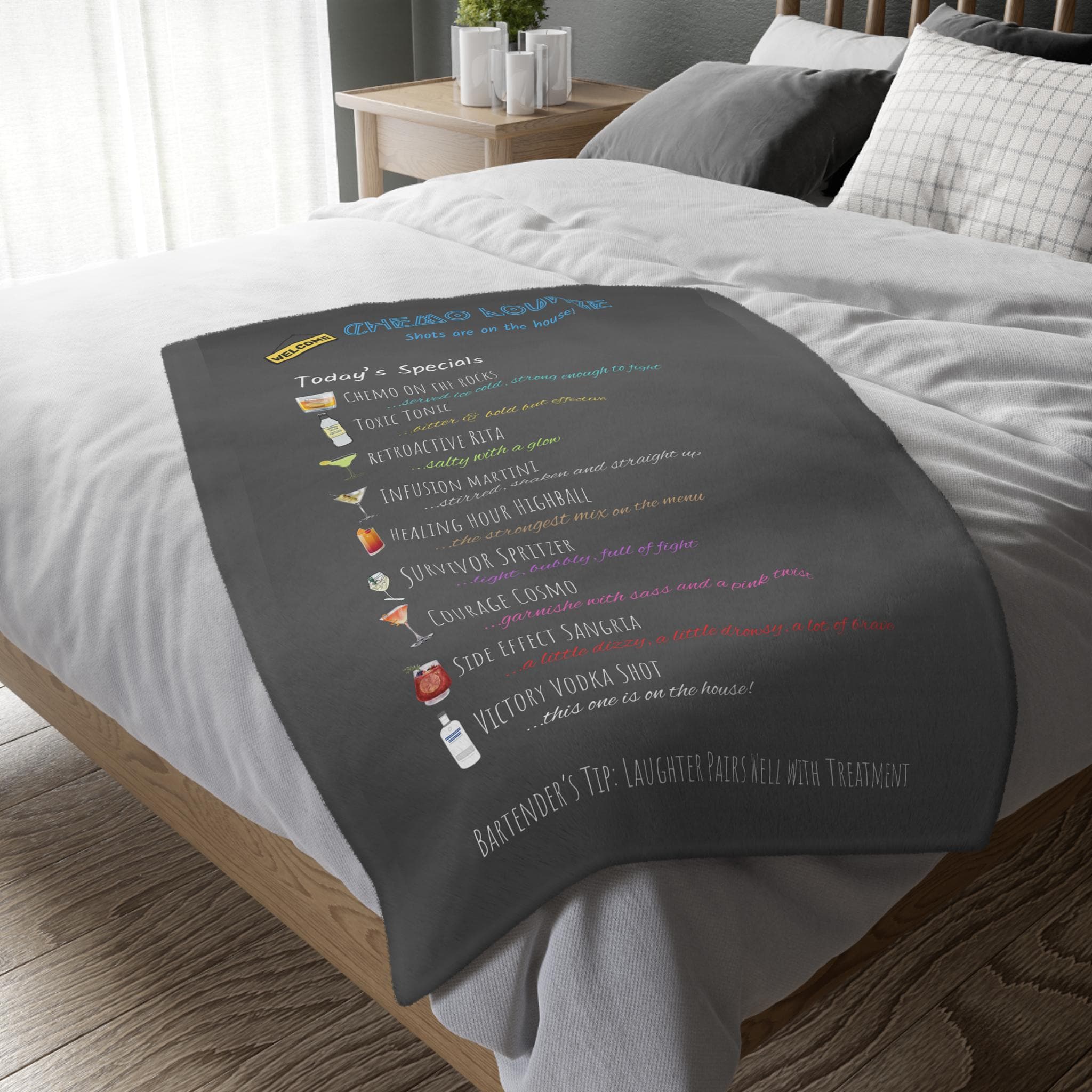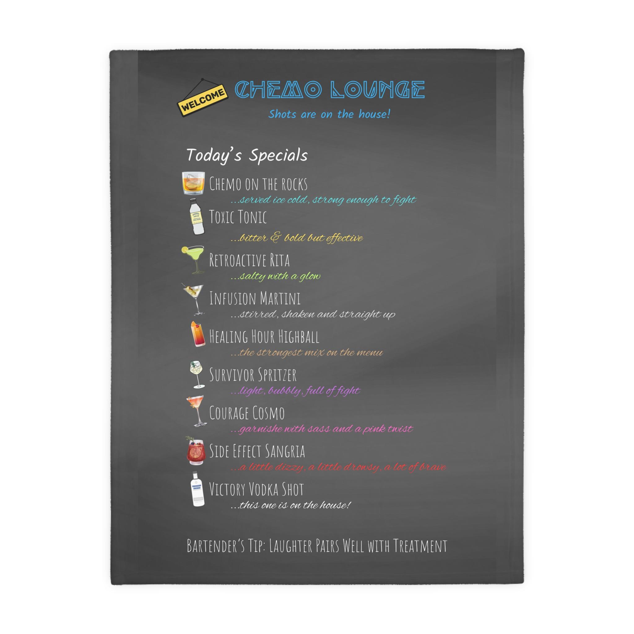 Infusion days just got a lot more fun — welcome to the Chemo Lounge. This cozy blanket doubles as a cheeky “cocktail menu,” featuring specials like Chemo on the Rocks, Courage Cosmo, and Healing Hour Highball.