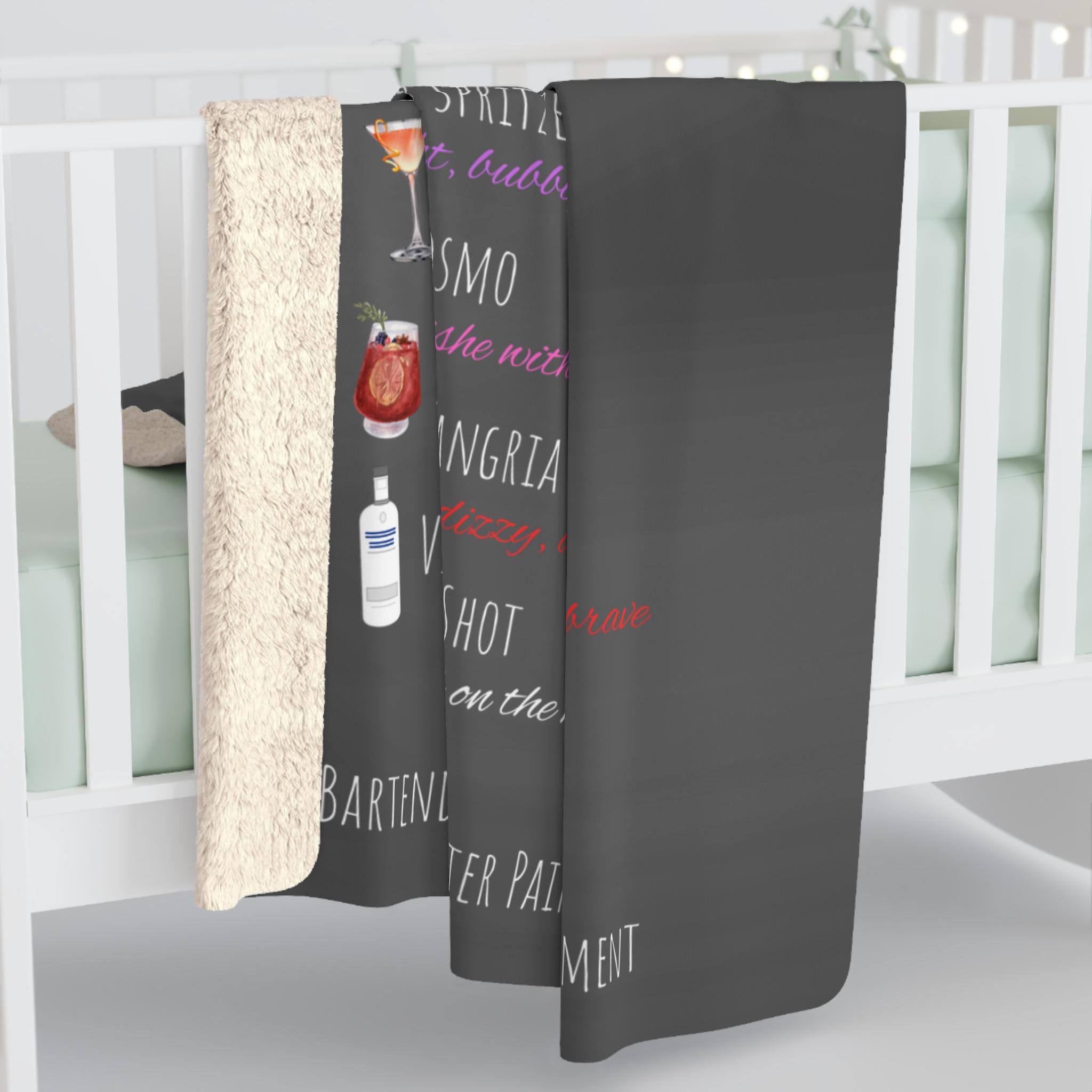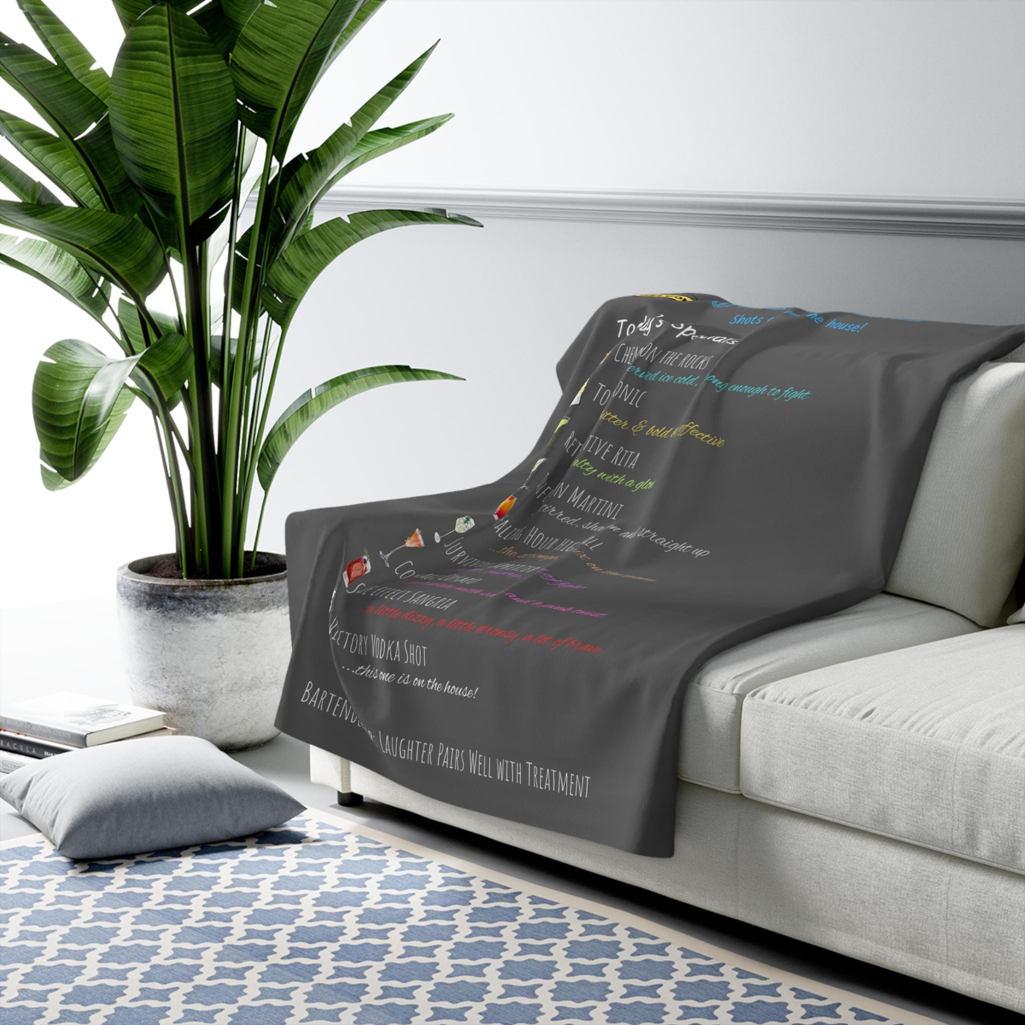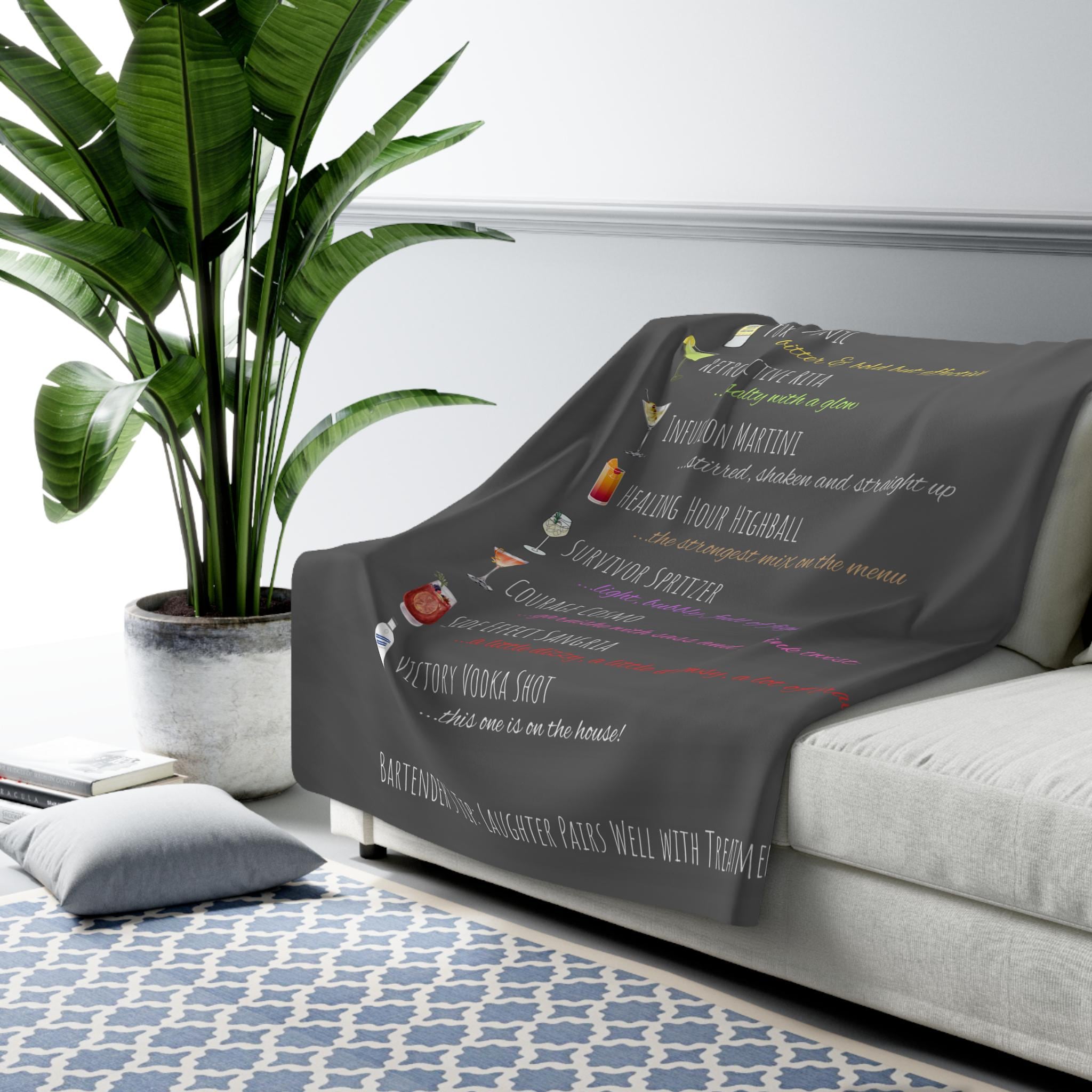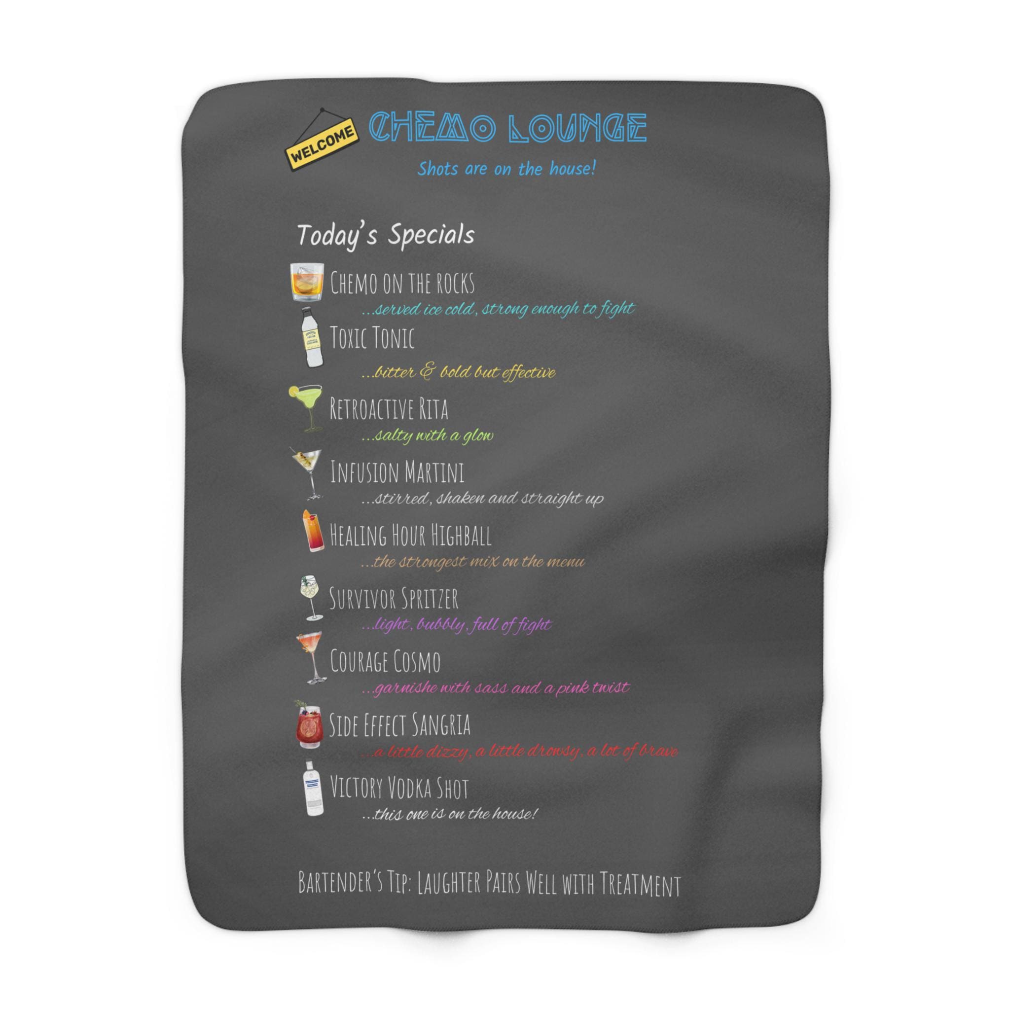 Infusion days just got a lot more fun. Welcome to the Chemo Lounge! This cozy blanket doubles as a cheeky cocktail menu; featuring specials like Chemo on the Rocks, Courage Cosmo, and Healing Hour Highball.